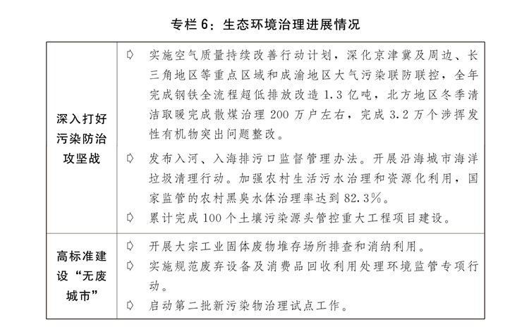 (九)坚持不懈推进生态文明扶植,全面绿色转型取得积极进展。出台加速经济社会成长全面绿色转型的看法,持续深切打好污染防治攻坚和,积极稳妥推进碳达峰碳中和,鼎力实施全面节约计谋,斑斓中国扶植成效较着。