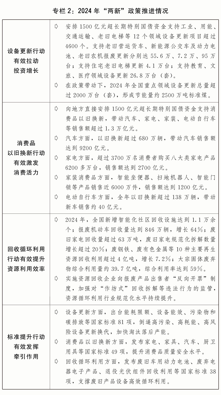 三是大规模设备更新和消费品以旧换新政策落地收效。印发“两新”步履方案,出台工业、建建市政、交通、农业、教育、文旅、医疗等七大范畴设备更新实施方案和消费品以旧换新、收受接管轮回操纵、尺度提拔引领步履方案。放置3000亿元超持久出格国债加力支撑“两新”工做。2024年,“两新”政策带动全国设备工器具购买投资增加15。7%,高于固定资产投资(不含农户)增速12。5个百分点;限额以上单元家用电器和音像器材类、家具类商品零售额别离增加12。3%、3。6%,带动大耐用消费品发卖额跨越1。3万亿元;消费品以旧换新勾当中,新能源汽车销量占比跨越60%,一级能效家电发卖额占比跨越90%。